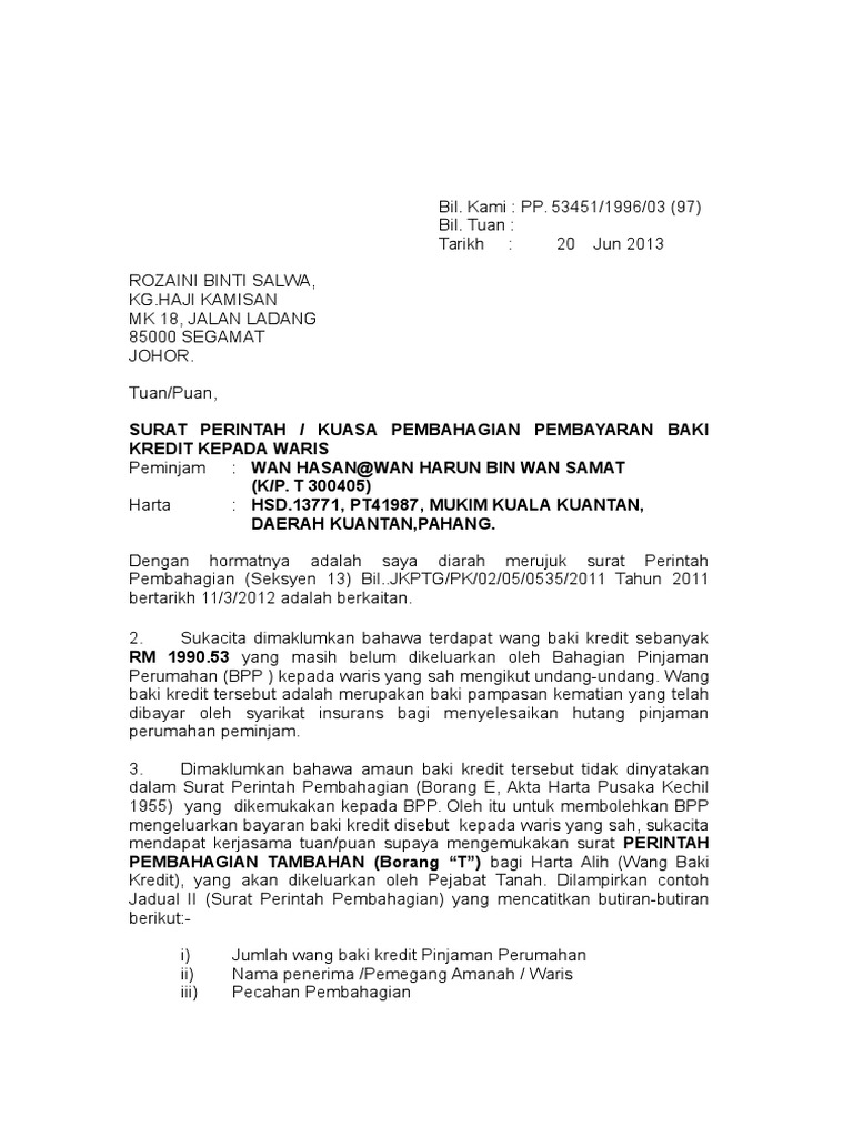 Jkkk parlimen permatang pauh kampung petani 14400 bukit mertajam pulau pinang. Surat kuasa mentadbir harta pusaka yang dikeluarkan oleh mahkamah tinggi pihak berkuasapejabat daerah di sabah atau sarawakjabatan ketua pengarah tanah galian persekutuan jkptg amanah raya berhad yang mengandungi maklumat wtd dalam senarai harta. Contoh Surat Permohonan Untuk Berbagai Keperluan.